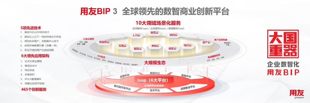 面對(duì)難得的市場(chǎng)和產(chǎn)業(yè)發(fā)展機(jī)遇,用友經(jīng)過(guò)6年的規(guī)模研發(fā)、持續(xù)迭代,以全新理念、全新技術(shù)、全新架構(gòu)、全新模式打造了面向企業(yè)和公共組織數(shù)智化的全新一代產(chǎn)品——用友BIP,并在平臺(tái)技術(shù)、應(yīng)用架構(gòu)、創(chuàng)新服務(wù)等方面實(shí)現(xiàn)多項(xiàng)重大突破與升級(jí),達(dá)到全球水平,包括5項(xiàng)技術(shù)、6大應(yīng)用架構(gòu)、465項(xiàng)創(chuàng)新服務(wù),覆蓋智能財(cái)務(wù)、數(shù)智人力、數(shù)智采購(gòu)、數(shù)智營(yíng)銷、智能制造、數(shù)智供應(yīng)鏈、數(shù)智研發(fā)、數(shù)智項(xiàng)目、數(shù)智資產(chǎn)及協(xié)同工作等十大核心領(lǐng)域,是目前全球領(lǐng)域覆蓋較多的企業(yè)云服務(wù)群。